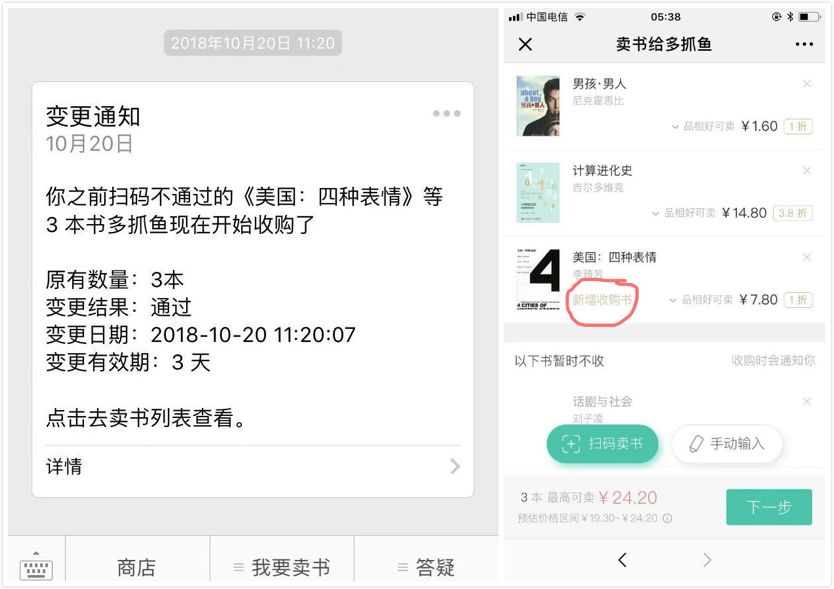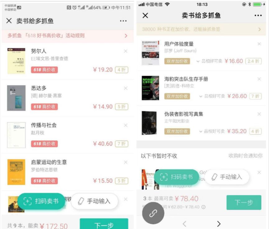 2018年7月初,随着大数据的积累,多抓鱼的收书价格由简单的“1折,2折,3折”开始变得更精确、多元(下右图),对于特别稀缺的图书,收购价格甚至高于原价。