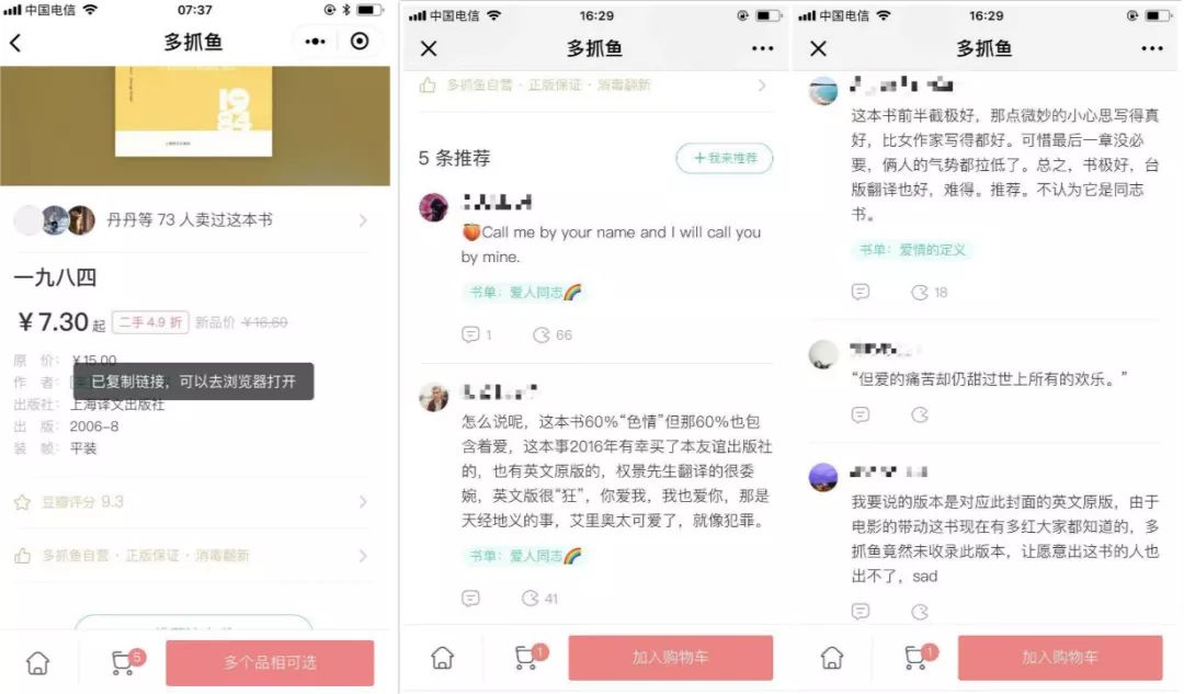 对于二手图书这种自带社交属性的内容电商,有社交才能增大用户粘性。只不过多抓鱼的社交做得很克制,是通过个人主页的改版和新版书单先社区化,再一步步渗透。