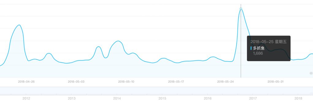 同时,根据百度指数中的搜索趋势:虽然 2017年5月多抓鱼已经正式上线,但百度指数直到2018年3月之前都是“查无此鱼”,直到3.11-3.17这一周才有了数据,刚好与上图公众号阅读量第一个激增的时间点相吻合。