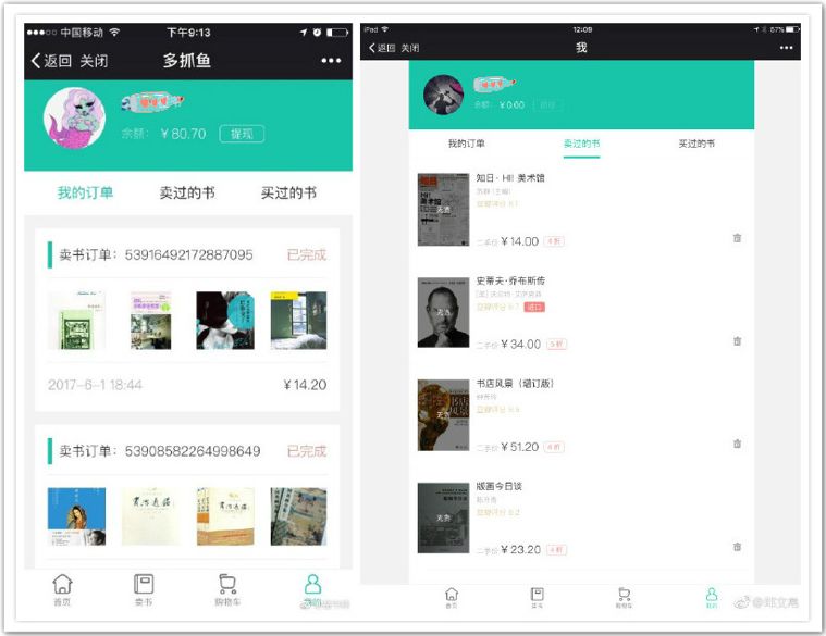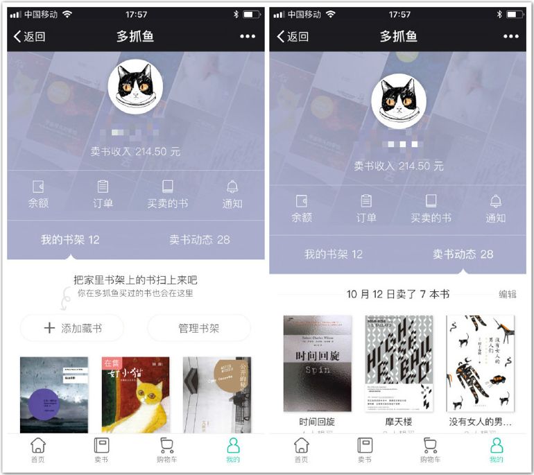 b.从买卖书的动态中追踪图书流转,用户可以看到自己手中的书是哪里来的,自己卖出去的书又到了谁手里(下左图),还有买卖统计来展示用户在平台的收益和售出率(下右图)。