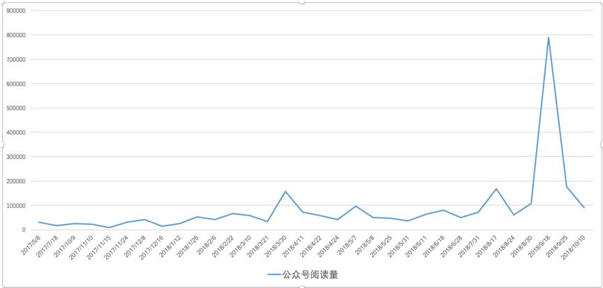 多抓鱼没有App(注:此文写于去年12月初,多抓鱼App于去年12月20日才上线),所以无法得到下载量、日活、月活、应用市场排名等数据,但根据其微信公众号截止2018.10.25共32篇头条推送的阅读数量统计(10万+的文章根据阅读量和点赞数的比例进行了预估),绘制了如下折线图: