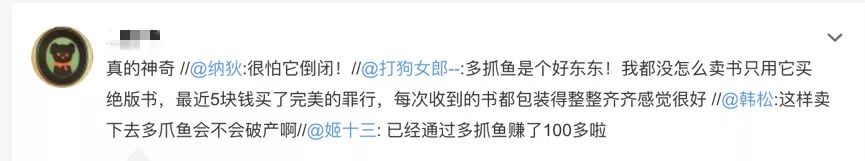 8月12日36氪转发了“超人测评”的文章《上线一周年超30万用户,“多抓鱼”二手书交易到底体验怎么样》,对比了C2B2C模式下多抓鱼、漫游鲸、转转二手书买卖的体验报告——多抓鱼以收书标准严格、二手书质量最佳荣登卖书买书体验Top1。