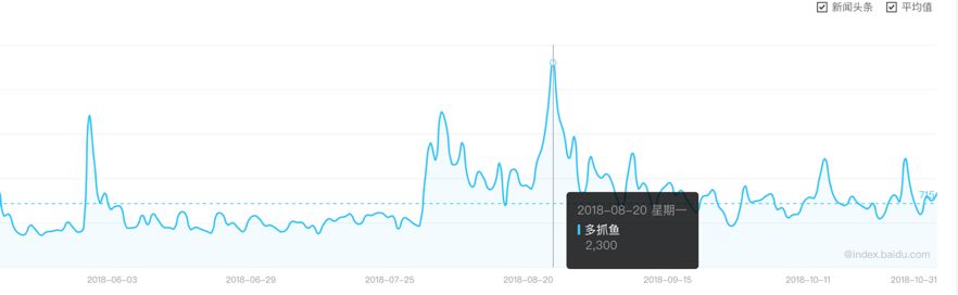 因为卡在匡扶摇刷屏前后,将爆红的多抓鱼的热度又往高推了推——8月20日当天的多抓鱼的百度指数达2300,是整个曲线图的最高峰,几乎是平均值715的3倍。