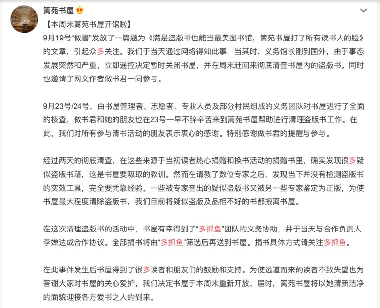 2017年9月19日,网红图书馆“篱苑书屋”因为存书盗版问题在朋友圈刷屏,多抓鱼主动派团队进驻图书馆,义务为篱苑书屋中所有存书进行正盗版甄别。