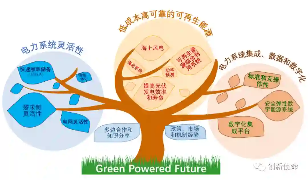 当前的绿色电力技术仍旧可以被看成是一颗有待成长的小树苗,为有效应对绿色电力技术创新所面临的三个重大挑战,“绿色电力未来”使命从低成本高可靠的可再生能源、电力系统灵活性、电力系统集成数据和数字化三个方面开展国际合作工作,标识出海上风电、高效新型光伏等十七个创新主题和100多项创新性技术。其中就包括,刚才所提到的海上风电、海上漂浮式光伏、海上全直流发电等技术。