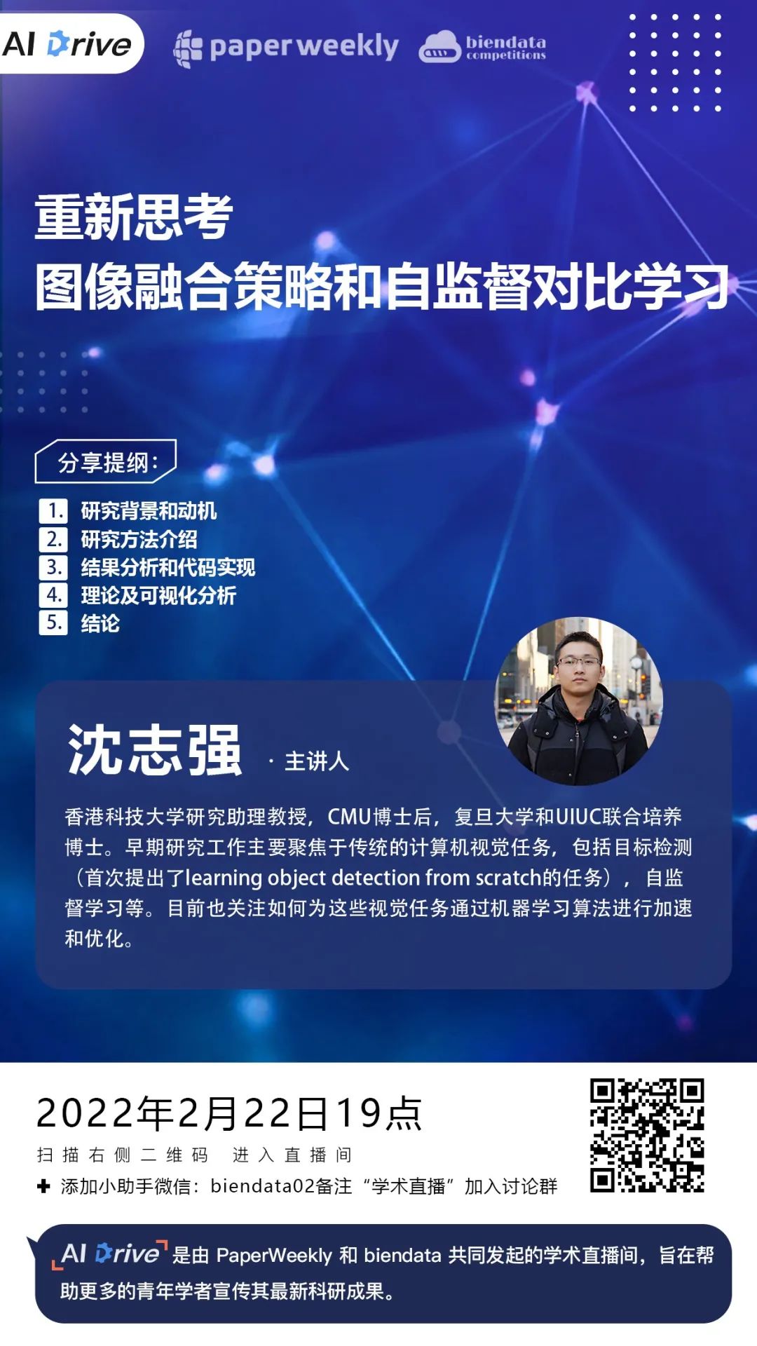 本期 AI Drive,我们邀请到香港科技大学研究助理教授沈志强,为大家在线解读其发表在 AAAI 2022 的最新研究成果:Un-Mix: Rethinking Image Mixtures for Unsupervised Visual Representation Learning。对本期主题感兴趣的小伙伴,2 月 22 日(本周四)晚 7 点,我们准时相约 PaperWeekly 直播间。