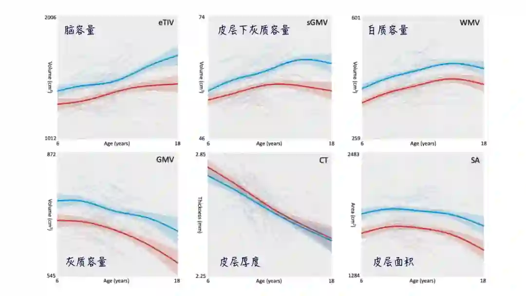 图 4 不同脑结构指标在学习鼎盛时期(6-18岁)的变化规律(女性红色,男性蓝色)