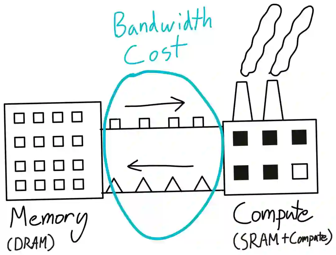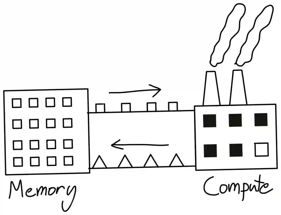 回到工厂那个例子,虽然工厂可以完成一些计算任务,但它并不是一个适合存储大量数据的地方。典型的做法是利用更便宜的硬件来建立一个数据仓库(DRAM),然后在仓库和工厂之间运送物资,也就是内存带宽。