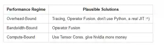 如果模型把大部分的时间都花在了内存传输上,那么增加GPU的FLOPS是没有用的。又或者如果你把所有的时间都花在执行大块的数学运算上,那么把你的模型逻辑改写成C++来减少开销也没有用。
