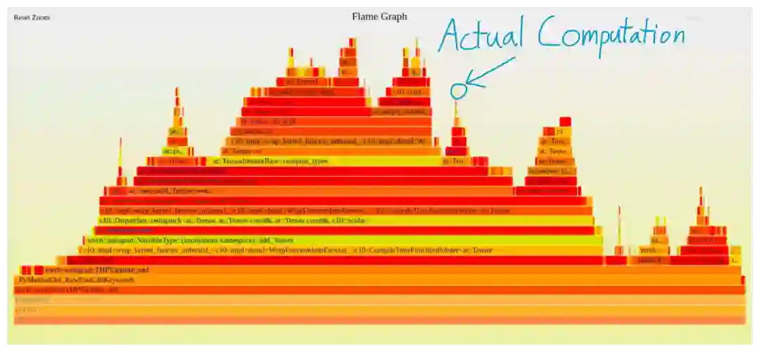 一个更直观的图可以看到,PyTorch执行一个加法时产生的配置文件,除了一个小方块外,其余所有的都是纯开销。