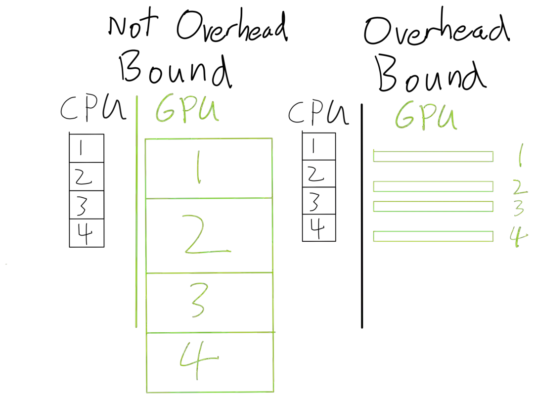 代码中没有花在传输或计算tensor的时间都称为开销(overhead),比如花在Python解释器上的时间,花在PyTorch框架上的时间,花在启动CUDA内核(但不执行)的时间都是开销。