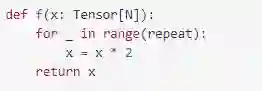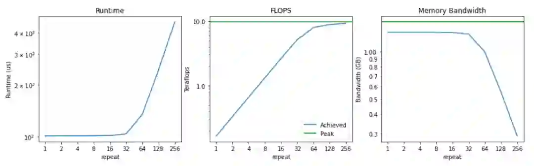 以一个PyTorch函数为例,并用融合编译器对其进行基准测试,然后就可以计算出不同的重复值所达到的FLOPS和内存带宽。