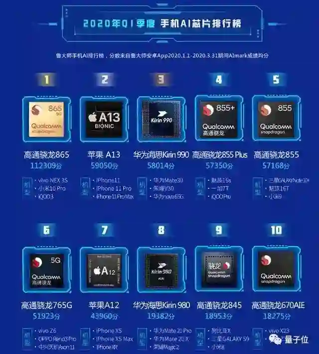 在鲁大师最新公布的AImark跑分中,高通骁龙865以11万的高分拿下芯片榜第一,不仅比高通上一代芯片提升一倍,也把苹果的A13仿生芯片远远甩在身后。