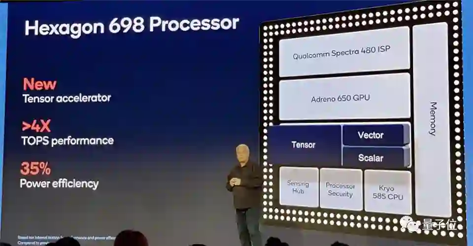 在去年骁龙855的Hexagon 690中,高通首次引入HTA实现了专用的可编程的AI加速。作为骁龙865集成的第五代Qualcomm人工智能引擎AI Engine的核心,Hexagon 698的HTA能效比上代提升了35%。