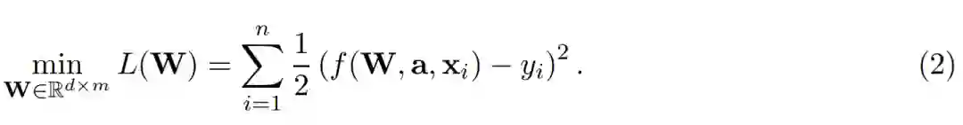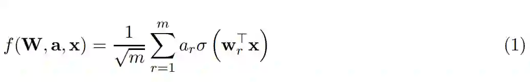 其中 x ∈ R^d 为 d 维实数向量输入,w_r ∈ R^d 为第一层的权重向量,a_r ∈ R 为输出权重。此外,σ (·) 表示 ReLU 激活函数:σ (z) = z if z ≥ 0、 σ (z) = 0 if z < 0。