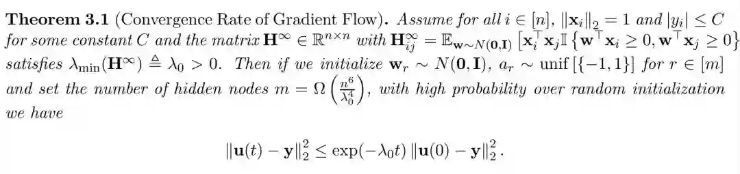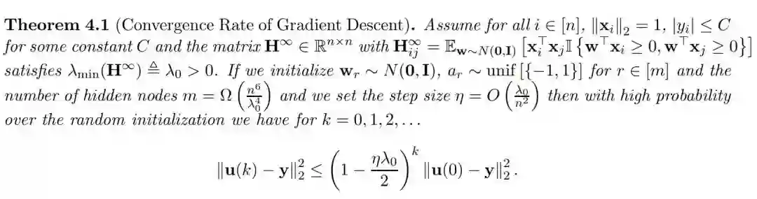 我们的分析基于以下观察:过参数化和随机初始化联合限制了每一个权重向量在所有迭代中都接近于它的初始值,这令我们可以利用比较强的类凸属性,并展示梯度下降能以全局线性的速率收敛到全局最优解。我们相信这些观点同样能用于分析深度模型和其它一阶梯度优化方法。