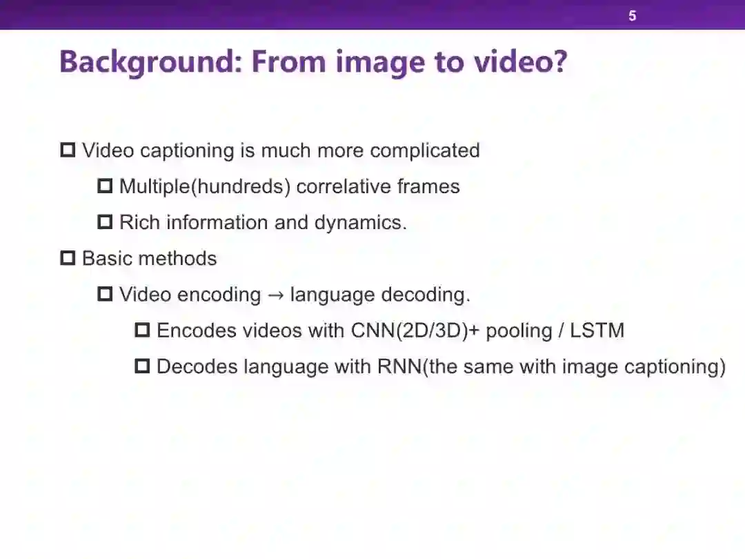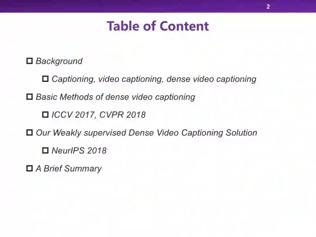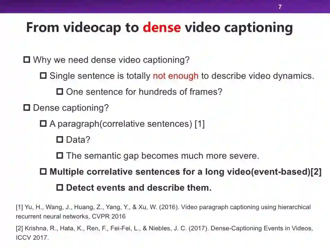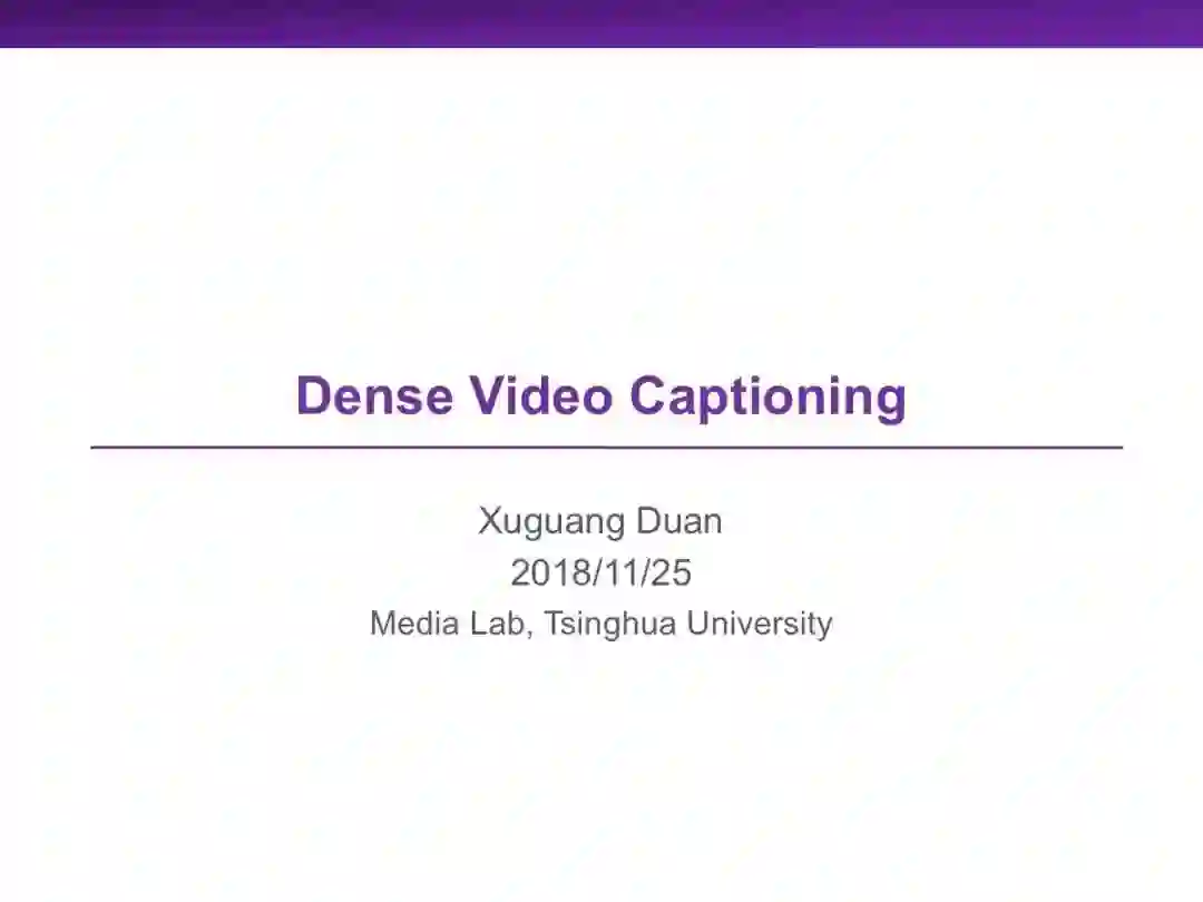 在跨媒体智能方向,视频-文本方向是一个非常重要的领域,其中视频描述生成通过将视频转换成描述视频内容的文本进行二者的交叉理解。本次报告中,我们将简要介绍视频描述生成的基本方法,并给出我们针对密集视频描述生成给出的解决方案。