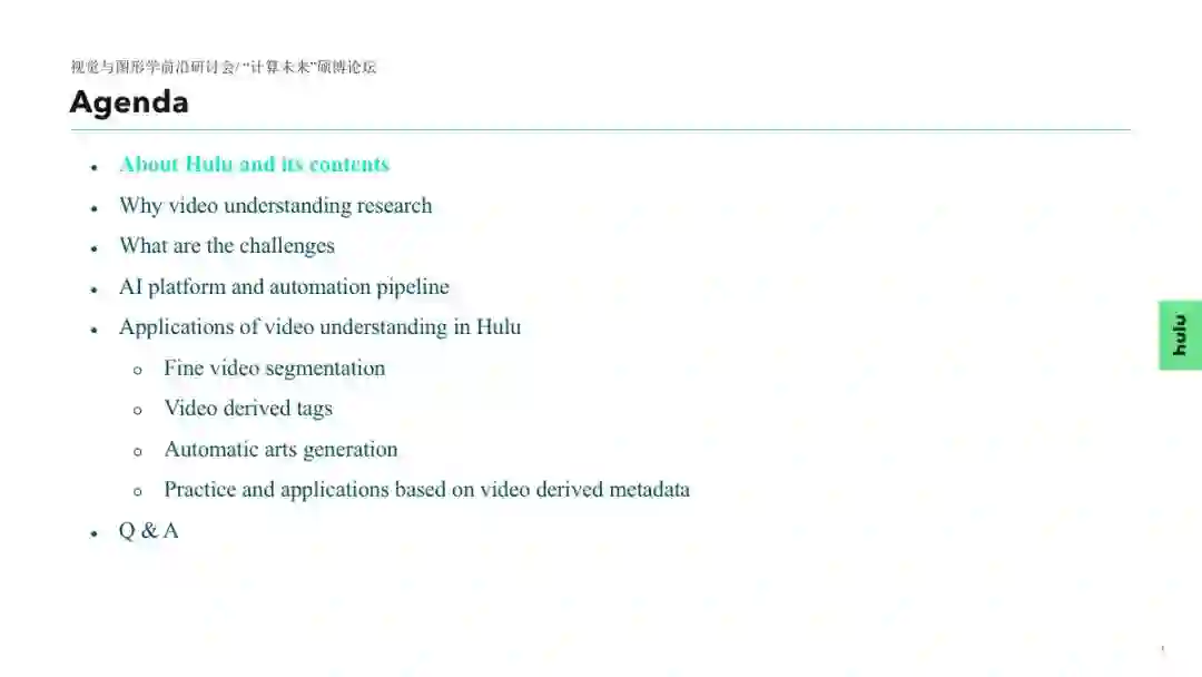 视频内容理解是极具挑战性的研究方向,伴随着深度学习技术的快速发展,该领域也受到了越来越多高校、研究机构和公司的关注。作为一家在线视频服务公司,Hulu 较早地启动了该领域的研究工作,在本次报告中,我们将介绍 Hulu 在该领域的相关研发工作,并分享 Hulu 取得的一些阶段性成果。
