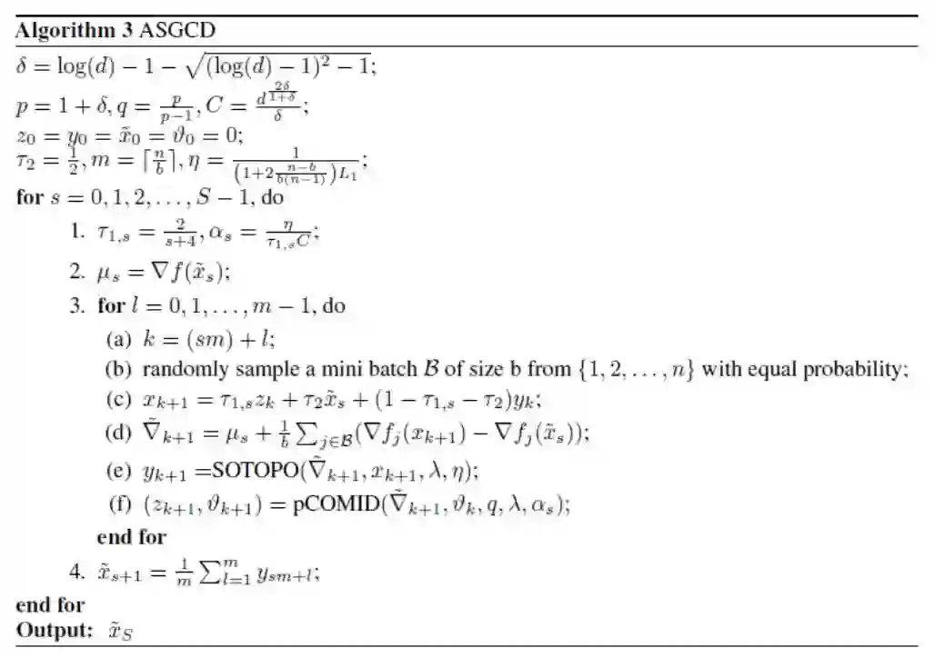 然后基于该新规则和软门限投影算法,通过和一个被精心选择的镜面下降 (mirror descent) 算法做线性耦合,我们加速 GCD 使之达到最优收敛率。与此同时,我们的第二个贡献是我们发现没有必要事先计算完整梯度:采样一个训练样本并计算噪声梯度而不是完整梯度,将足以实现贪心选择。该随机优化方法可以样本大小的倍数减少贪心选择的复杂度。最终的结果是一个加速随机贪心坐标下降算法 (Accelerated Stochastic Greedy Coordinate Descent,ASGCD)。ASGCD 描述如下: