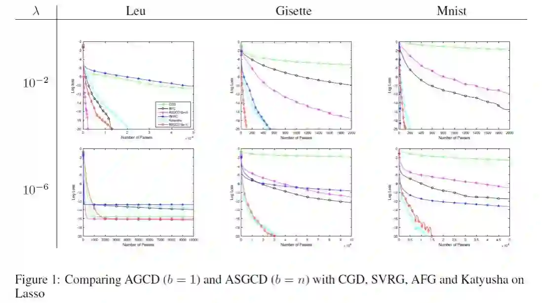 关于该算法的参数设置等说明请见原文。ASGCD 算法具有理论上的最优收敛率,而且对样本稠密且解稀疏的问题,ASGCD 相对于当前最好的算法,如 Katyusha,具有更好的收敛速度。实验如下所示,也验证了这一点。