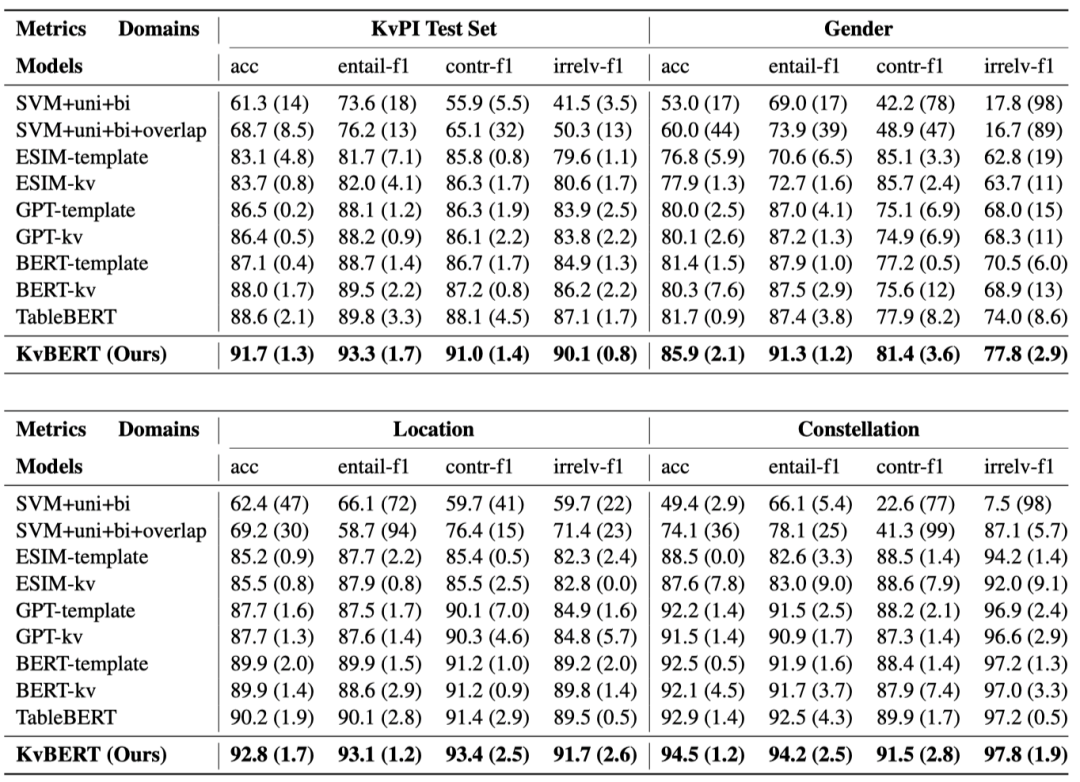 我们在KvPI数据集以及其中的各个子属性上进行了大量的实验,以充分验证模型的一致性识别能力。和已有的工作类似,我们使用准确率(accuracy)作为主要评价指标。同时,我们也计算了每一个一致性类别下的f1-score作为模型能力的细致化度量。基线模型方面,我们选取了从统计方法、循环神经网络方法到最新的预训练模型中具有代表性的若干模型。