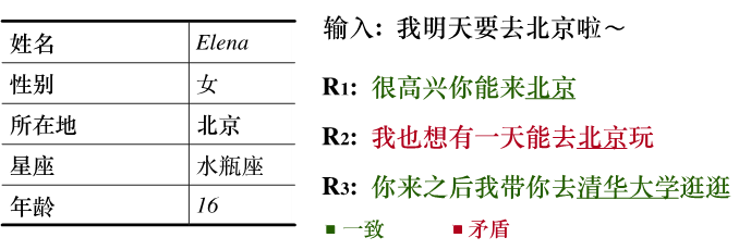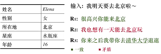 在图1中,左边部分是对话系统预设的角色信息,该信息是以结构化键值对(key-value pairs)的形式给出的;右边部分是一个对话片段,包括一句对话输入和若干对话回复。在这些对话回复中,虽然R1和R2都包含了给定的地点词“北京”,但是这两个回复关于位置信息的含义却完全不同:R1表达了欢迎其他人来到自己所在地的含义,暗示了说话人现在正位于北京;而R2表达出了希望能够去一次北京的含义,因此可以推断出说话人不可能在北京。对于人类而言,理解这些一致性关系是很自然的;对于机器而言,现阶段它们仍然难以理解这些关系。现有的角色化对话生成模型已经能够结合给定的人设、角色信息较好地生成类似R1 和R2的回复;准确理解一致性关系的能力已经成为了进一步提升对话一致性的关键瓶颈。