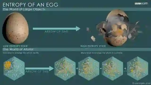 我们无法目睹破碎的鸡蛋恢复如初,这是因为存在着无数中排布这些鸡蛋碎片的方式,而其中几乎所有的排布方式最终的结果都是一个破碎的鸡蛋而不是一个完整的鸡蛋。相似的,融化的冰不会倒回去,点燃的火柴不会倒回去,你擦伤的膝盖也不会倒回去。
