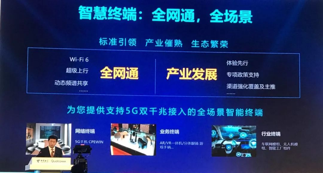 同时,柯瑞文指出,中国电信将为客户提供5G双千兆接入的全场景智能终端,不只是手机,也不限于CPE,还包括VR/AR、游戏手柄等业务终端,以及无人机模组、车联网模组等行业终端,“如果我们不在行业终端上有所突破,整个产业升级将面临很大困难。”