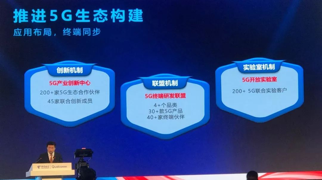 此外,在5G终端研发联盟中,中国电信已经联合40多家终端合作伙伴,开发了4个品类、30多款5G产品。