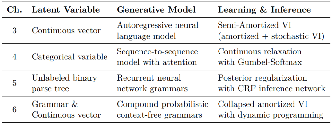 整体来说,每章节都阐述了专用于特定语言领域建模的深度潜变量模型,并扩展均摊变分推理以解决相应潜变量模型使用过程中遇到的一些问题。作者预测这些方法将广泛应用于其他相关领域。