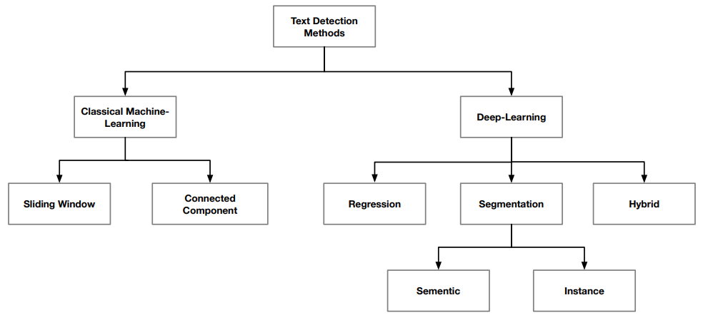 文本检测方法可以划分为经典机器学习和深度学习,其中经典机器学习方法包括滑动窗口(sliding window)和连通分量(connected component),深度学习方法包括回归(regression)、分割(segmentation)和合并(hybrid)。