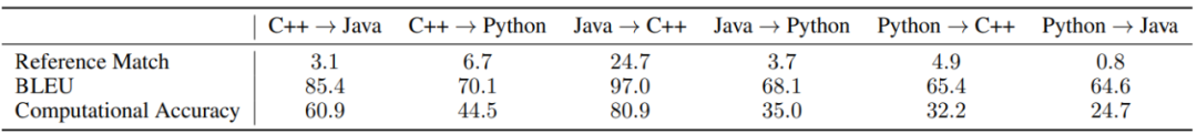 在使用贪婪解码(greedy decoding)时,TransCoder 在测试集上的结果。