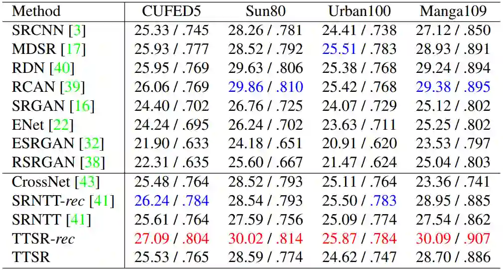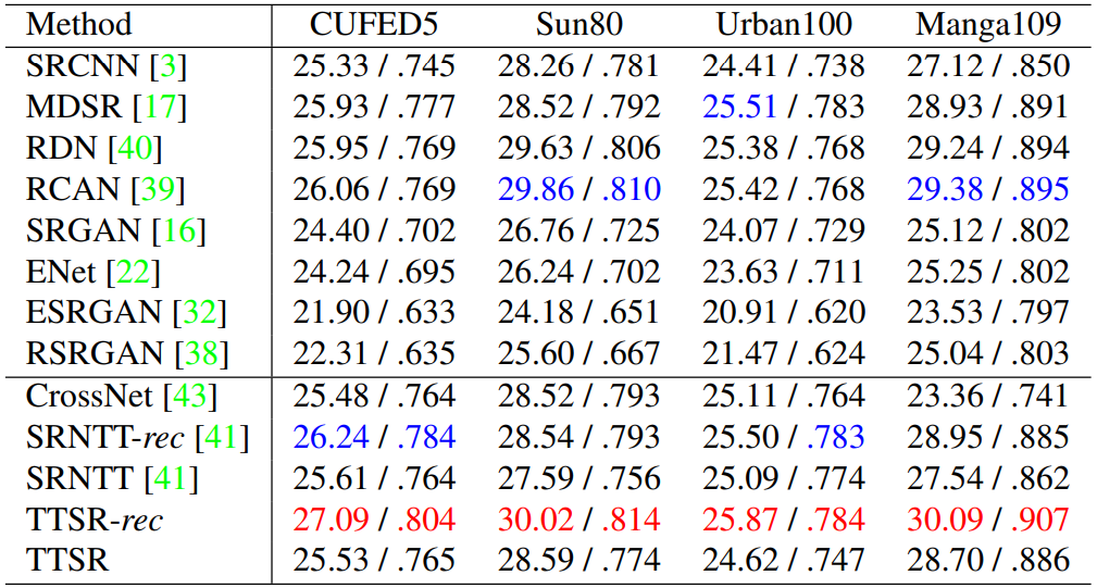 大量的实验表明,TTSR 在定量和定性评估两方面较当前 SOTA 方法均有显著提升。
