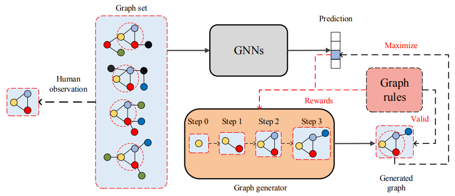 XGNN 工作流程图。图神经网络表示我们要解释的一个训练过的图分类模型。