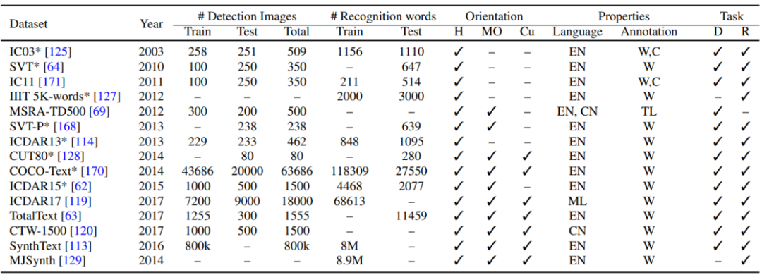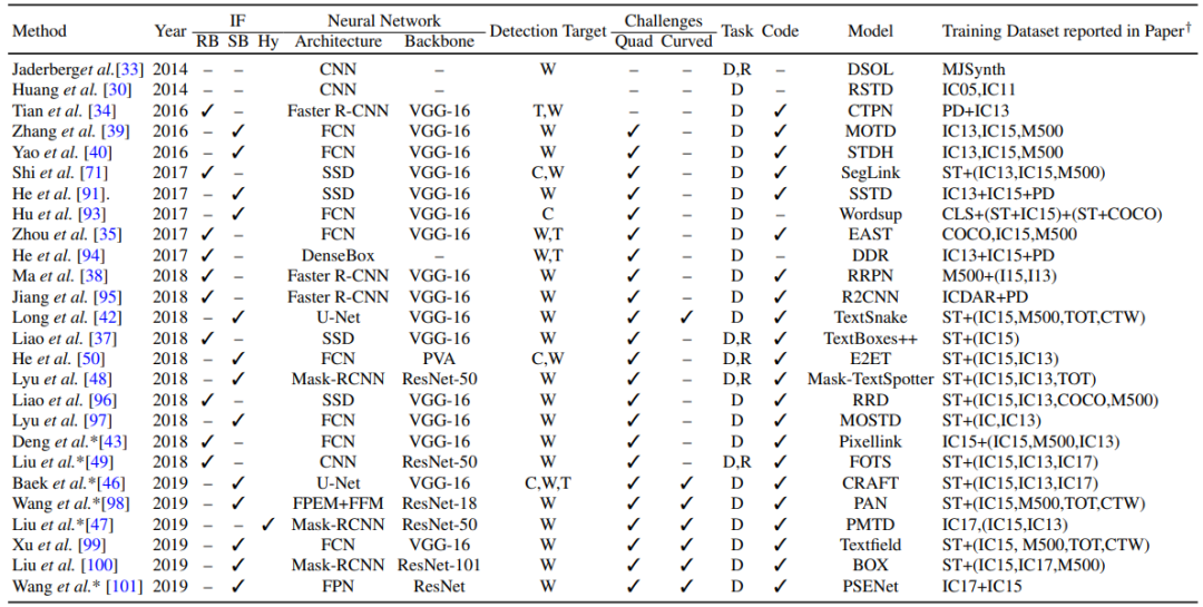 基于深度学习的文本检测方法,其中 W 表示单词、T 表示文本线条(text-line)、C 表示字符、D 表示检测、R 表示识别、RB 表示基于候选区域(region-proposal-based)、ST 表示合成文本(synthetic text)。
