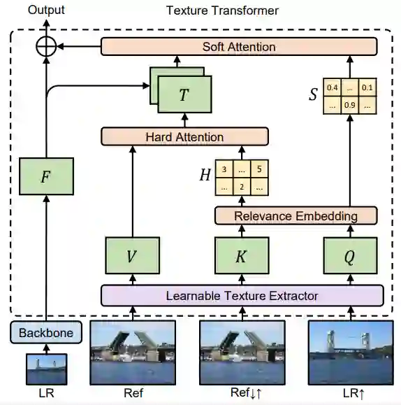 ,其中低分辨率(LR)和参考(Ref)图像分别表示为 Transformer 中的查询和关键字。TTSR 包含四个紧密相关且针对图像生成任务进行优化的模块,即 DNN 的可学习纹理提取器、相关性嵌入模块、用于纹理迁移的硬注意力模块以及用于纹理合成的软注意力模块。