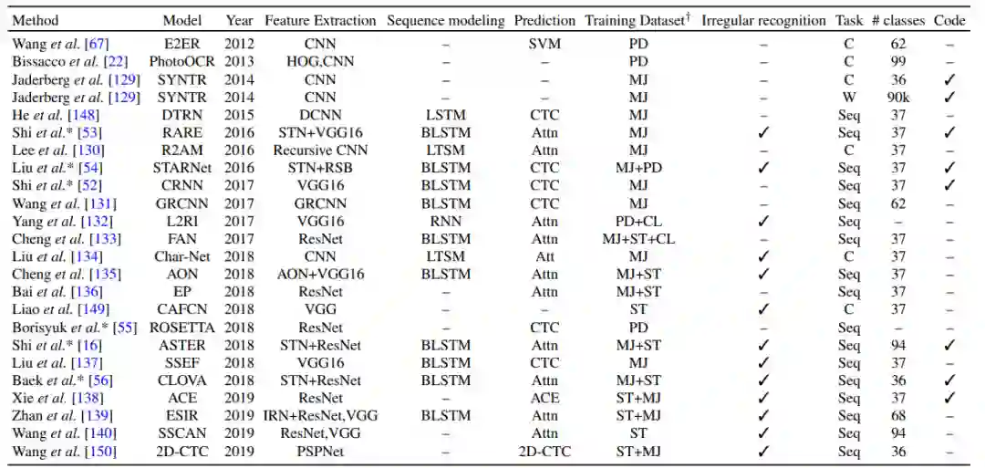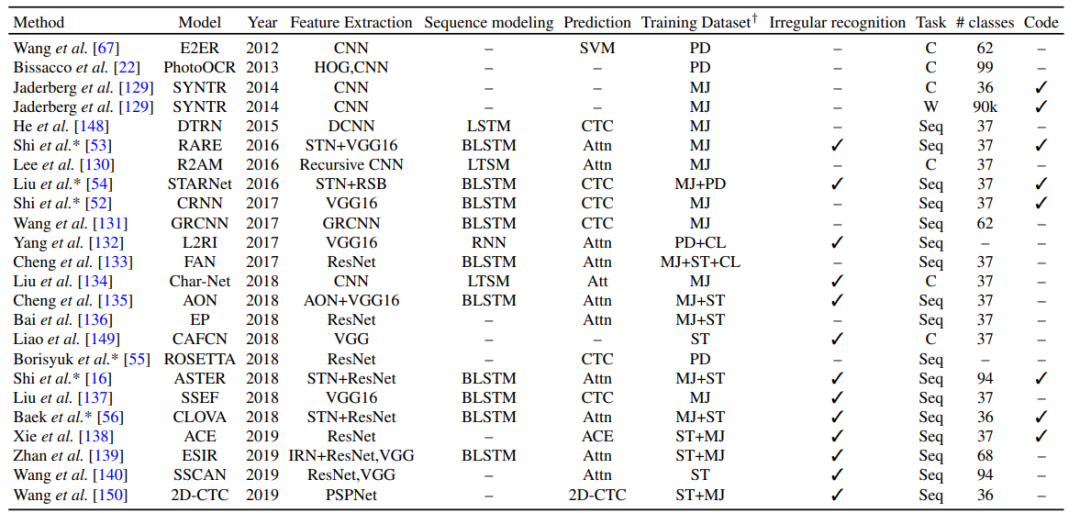 基于深度学习的 SOTA 文本识别方法,其中 TL 表示文本线条、C 表示字符、Seq 表示序列识别(sequence recognition)、PD 表示私人数据集(private dataset)、HAM 表示层级注意力机制(hierarchical attention mechanism)、ACE 表示聚合交叉熵(aggregation cross-entropy)。