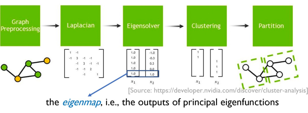 这些方法基于图邻接矩阵(graph adjacency matrix)定义一个核,计算其主特征函数,并以其输出作为节点的表示,完成后续的聚类等任务。上述 Eigenmaps 是谱学习中的核心概念,也被证明是能够维持数据流形上的局部邻域结构的最优表示。