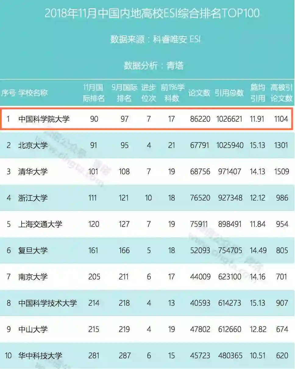 2018年11月ESI综合排名 数据来源:青塔