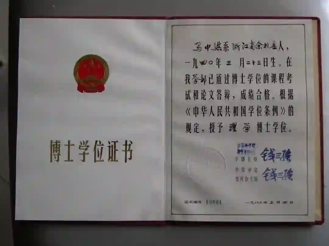 国科大1978级校友、新中国第一个理学博士马中骐的博士学位证书