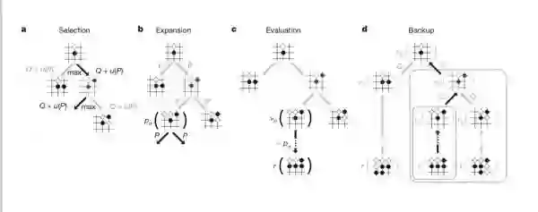 给定一个大的状态空间。我们从一个初始值开始,用一些探索和开发的平衡来选择行动,直到达成一些结论。这些信息是反向传播的,我们学习了棋局位置的价值。