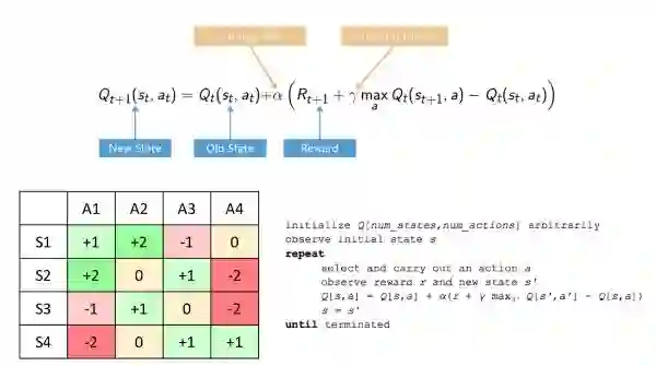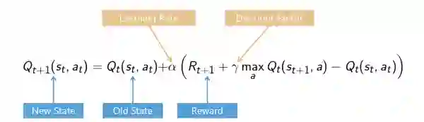 Q-Table ( Q 代表动作的质量 )通过随机的方式进行初始化,并且通过迭代地使用贝尔曼方程不断进行更新 Q(s,a) 来给出越来越好的近似。随着时间推移,我们对状态和行动好坏的估计便会形成一张最优的 Q-Table。