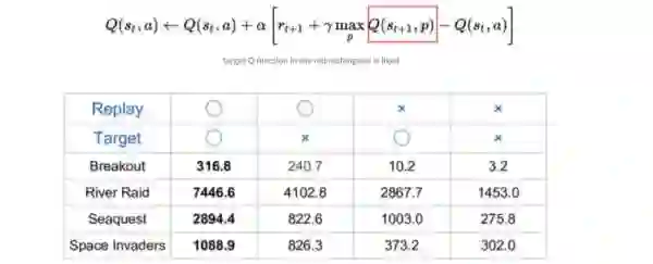 我们使用神经网络来估计当前状态的值,然后使用它与时间相乘。在运行这个神经网络的同时,我们也在更新这个网络。因此,损失函数中的目标函数改变了,会造成稳定性的问题。所以,我们通过每1000步进行更新来修正这个神经网络。