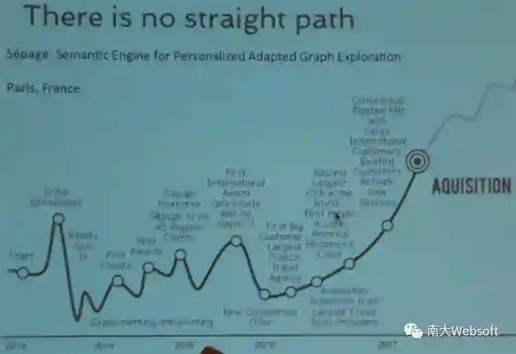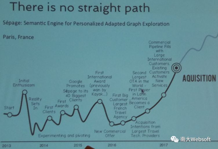该讲者主要讲述了其使用语义网技术的旅游应用的创业经历(如下图所示),刚开始13年他在一次会议上作报告时获得了投资,后艰难发展迎来第一个客户,…,最终17年初创公司成功被大企业收购