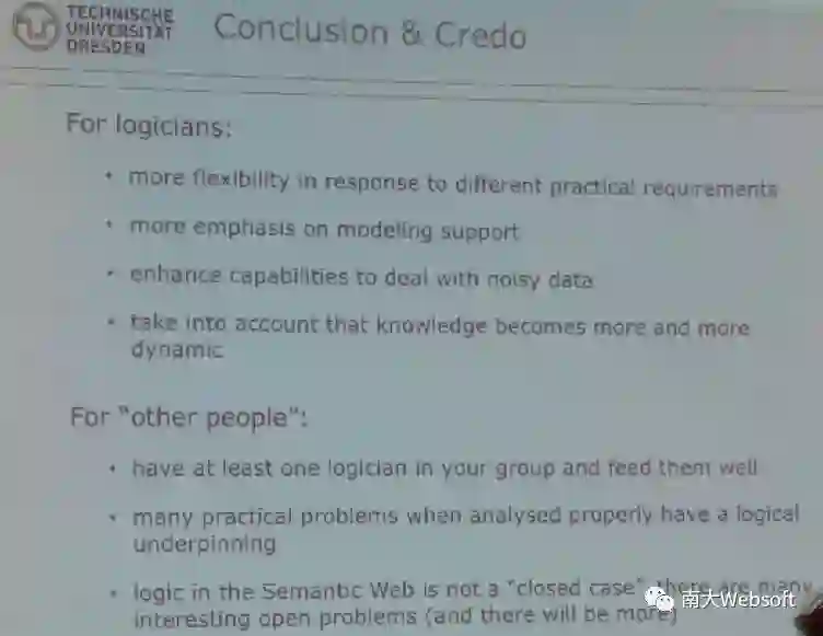 下图展示了讲者在总结部分对逻辑学家和其他语义网工作者的一些提示。