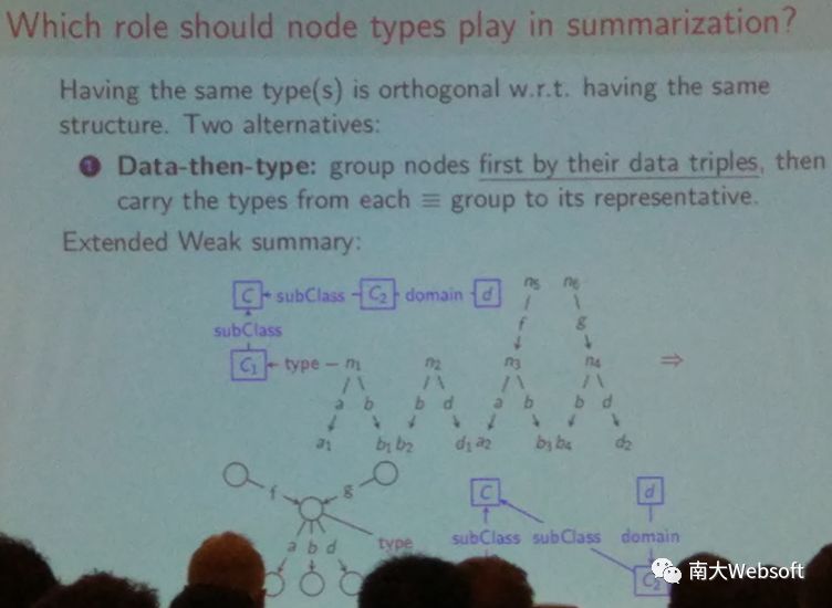 讲者分析了一些基于频繁模式和统计数据的相关工作,并介绍了一种先挖掘数据频繁模式,再考虑类型结构的方法。同时报告者还通过该摘要方法发现了存在于当前知识库中的一些噪音数据,比如DBpedia中存在一些实体的birthplace是自己。