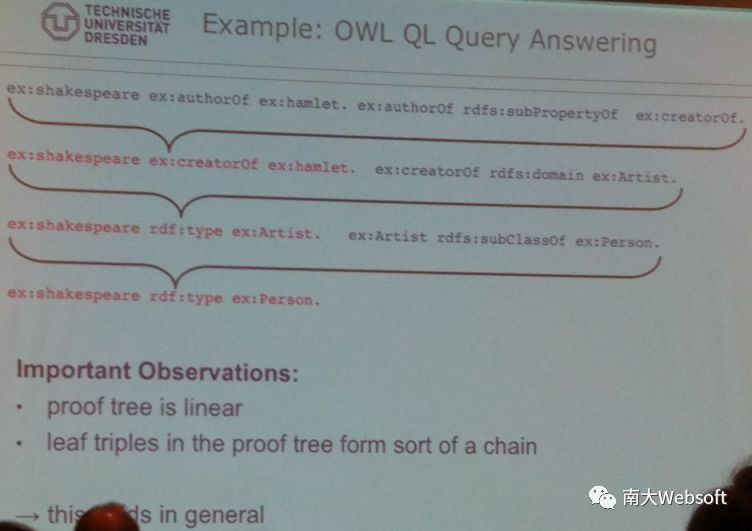 上图展示了逻辑在问答中的作用。如果我们要查询知识库中所有的人,那么逻辑推理能够给我们很大帮助,例如利用subClassOf/subPropertyOf推理、domain/range推理等等。