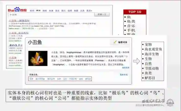 简单来说,获取概念词的来源主要有三个,1)搜索引擎中检索得到的高概率的同现词,2)在线百科的类别标签3)词语的构词法,对于很多词,其后缀即为该词的概念词,例如像微软公司的公司就是微软公司这个实体的概念词。之后,采用排序算法对获取得到的这些候选概念词进行打分,然后截取超过一定阈值的候选概念词保留到《大词林》中。