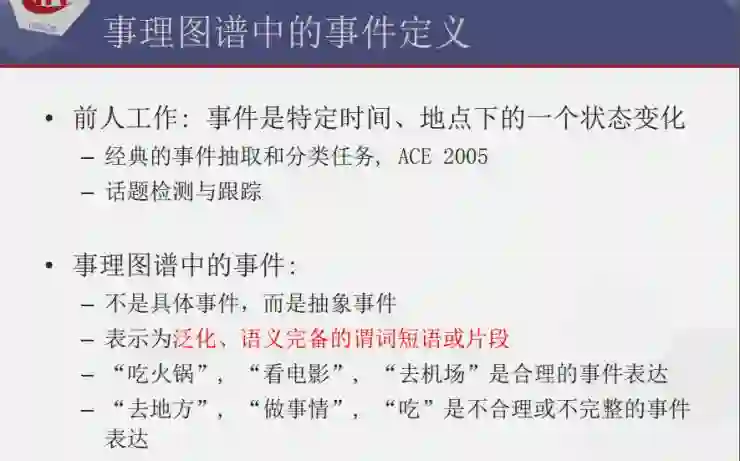 事理图谱中的事件定义。事理图谱中的事件是一个泛化的抽象的事件,比如吃火锅,去机场 ,看电影都可以,但要是说非常的具体,某年某月干了什么,这就不是事理图谱中存储的知识。但也不能太抽象,比如,去地方,做事情,也不是事理图谱中存储的知识。事件间的关系就两种,一种顺承关系,吃饭,买单,离开餐馆,这就是很常见的事件顺承关系。还有就是因果关系,我们认为因果关系是非常重要的,只有因果关系建立了,才能通过控制因变量去影响结果。