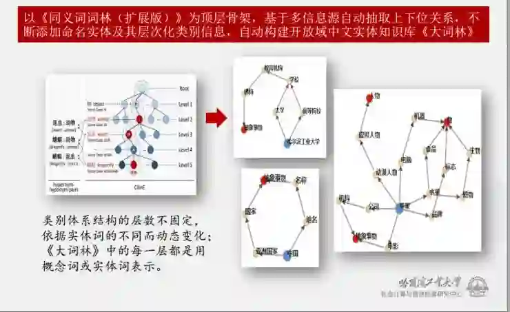 这里简单介绍一下作为《大词林》的骨架-《同义词词林(扩展版)》存在的问题。《同义词词林》的第一个问题是仅具有固定的5层结构,但面对千万级乃至亿万级规模多领域、多样性的词汇,固定的结构显然无法对其进行有效描述;第二个问题是《同义词词林(扩展版)》包含的词语数目非常有限,且大部分为抽象的概念,其规模不到十万词,显然不适合实际应用。基于此,刘挺教授带领的团队决心打破《同义词词林(扩展版)》的上述限制,从而形成了现在的《大词林》。首先,《大词林》的层数是不固定的,其根据词语的抽象程度自动进行层次化;其次,《大词林》中包含了很多具体的实体(例如人名、地名、机构名),其规模是《同义词词林(扩展版)》的数百倍,并且还在不断的扩充。